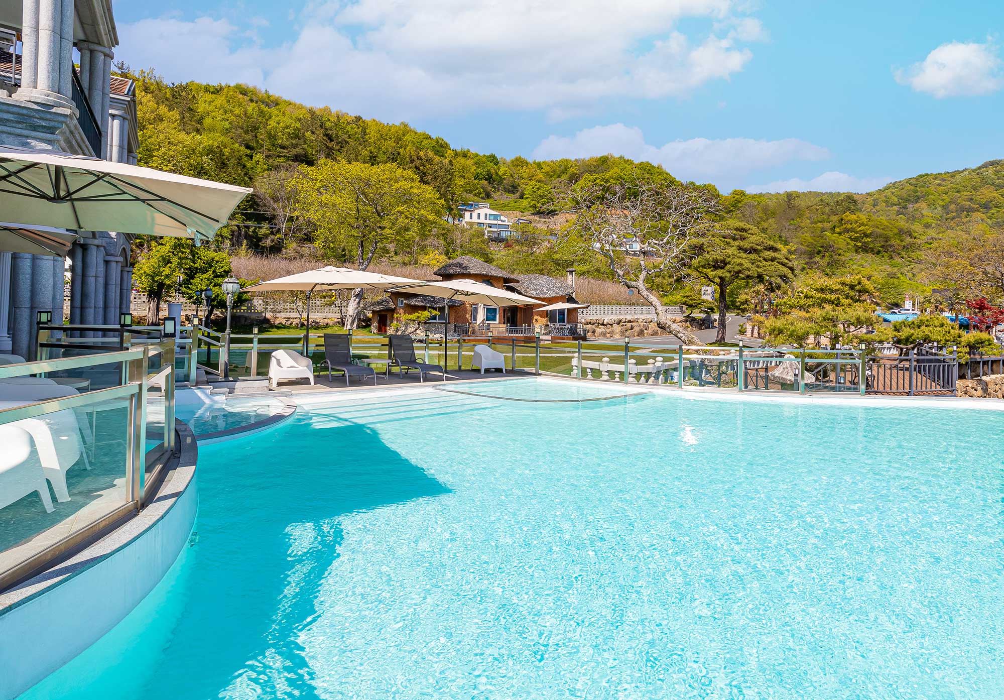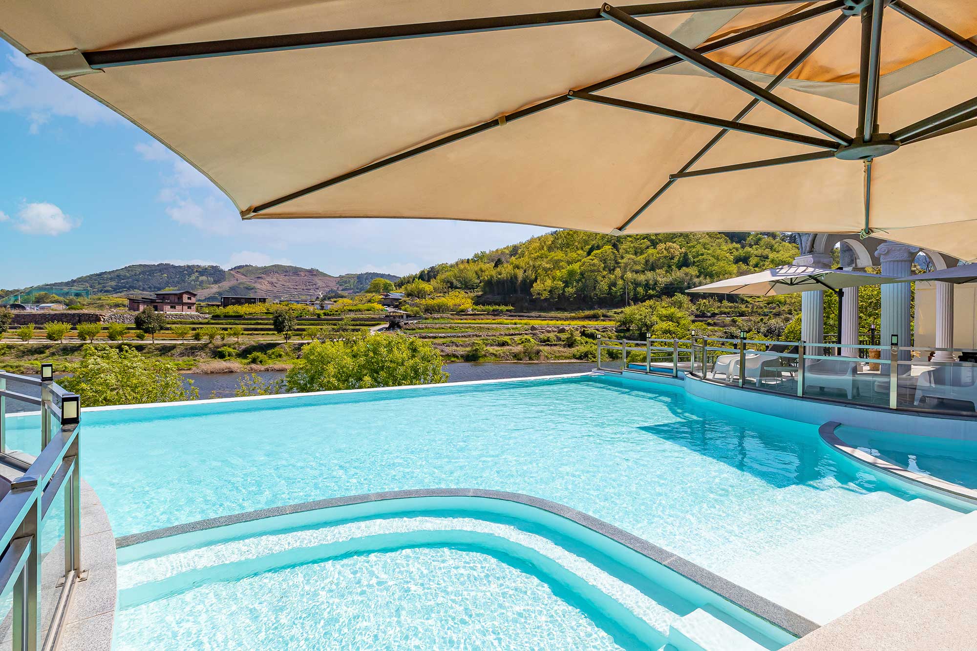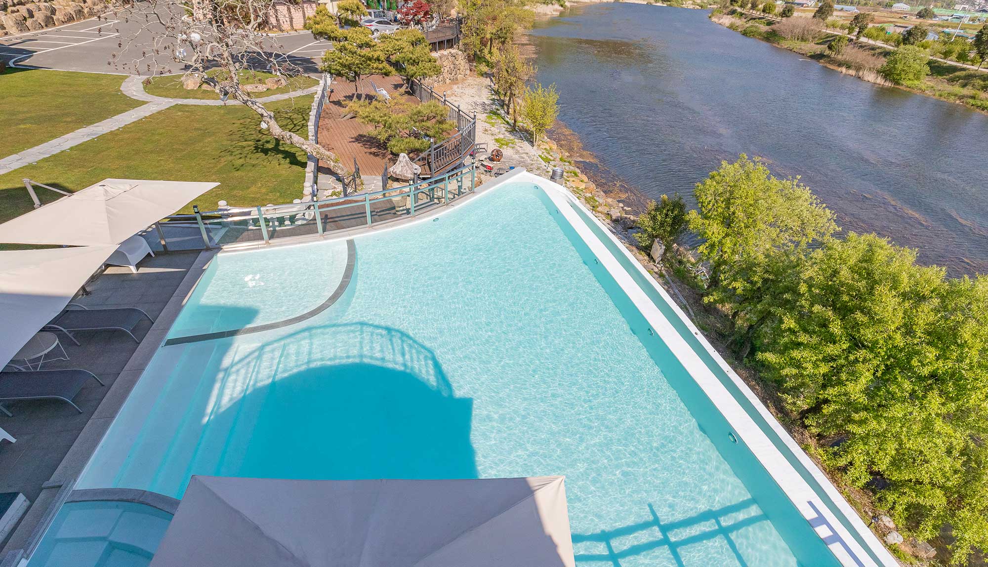 탁 트인 전망과 넓은 공간, 그리고 강을 향해 길게 이어지는 듯한 레이크 인피니티 풀은 국내에서 경험하지 못한 특별한 환경을 제공하며, 키즈 전용풀도 함께 자리 잡고 있습니다. 풀 사이드에 마련된 선베드에서 여유로운 휴식을 만끽하시기 바랍니다.